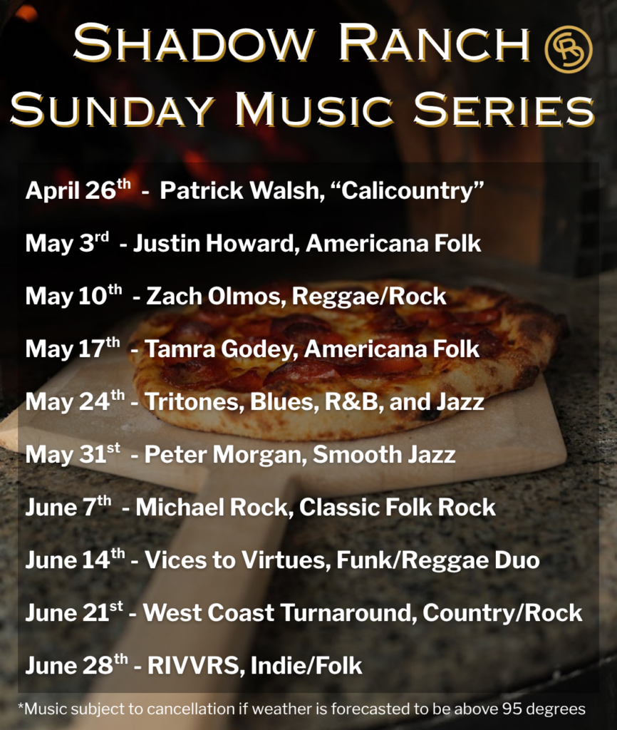 Join us every Sunday all summer for live music and wood-fired pizzas on the Shadow Ranch patio! We can’t wait to welcome you all back for another great season. See below for the music lineup.