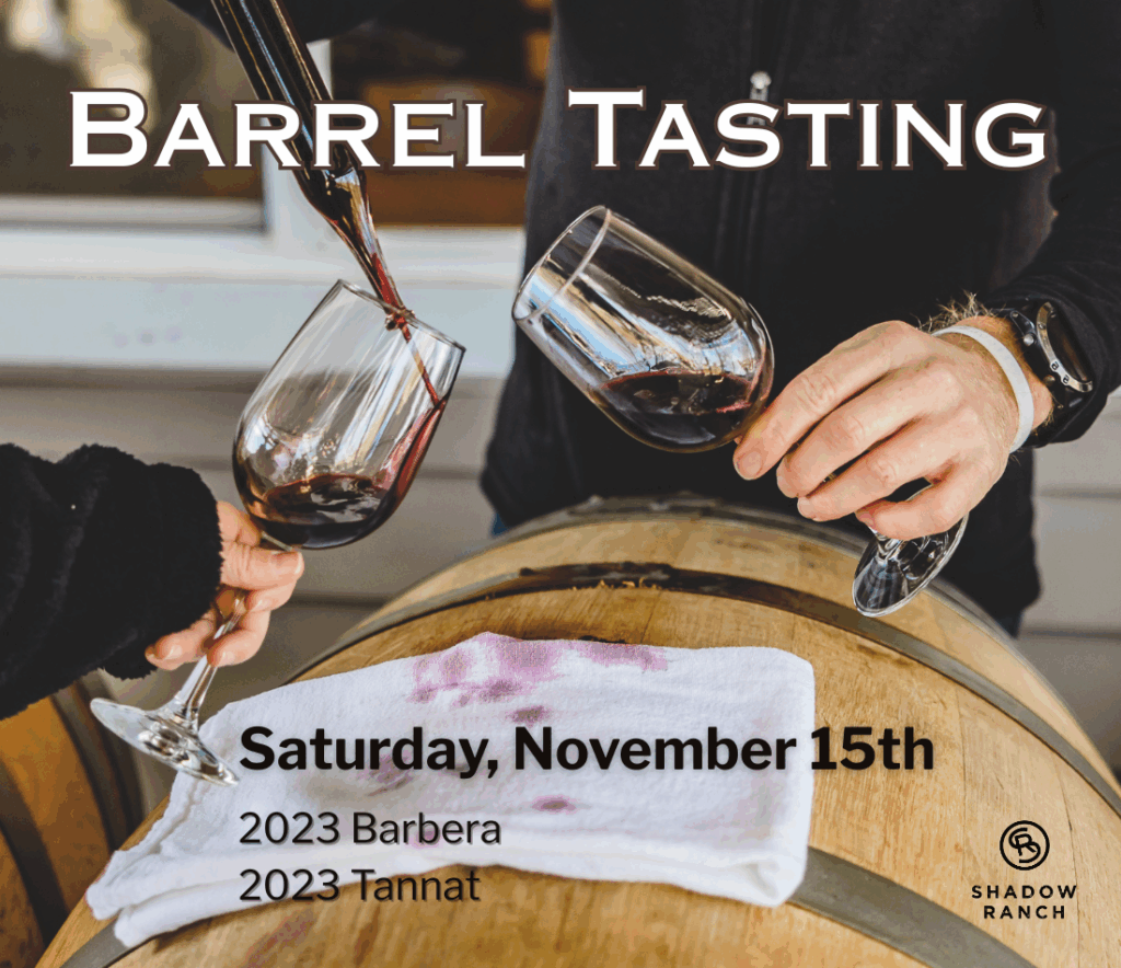 Come by on Saturday, November 15th for a chance to taste upcoming Shadow Ranch wines straight from the barrel! Winemaker Sam Patterson will be there to pour the 2023 Barbera and 2023 Tannat for you. You will also have the opportunity to purchase futures on these great new wines!