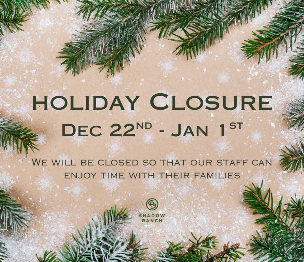 Shadow Ranch will be closed for the weekend between Christmas and New Years so that our staff can enjoy time with their families. We wish you all happy holidays and look forward to seeing you in the New Year!