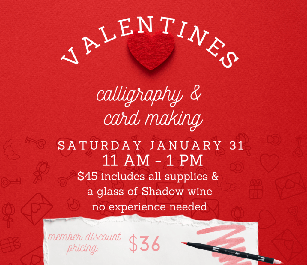 Celebrate love, creativity, and a little wine at our Valentine’s Day Paint & Sip inside the tasting room. Guests will enjoy a guided modern calligraphy workshop focused on foundational lettering techniques. After the workshop, you’ll put your new skills to use by creating handmade Valentine’s Day cards. Sip on your favorite wines, unwind, and leave with three custom cards and a new creative skill.